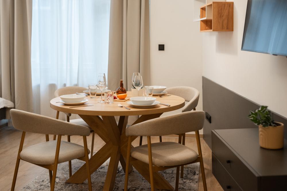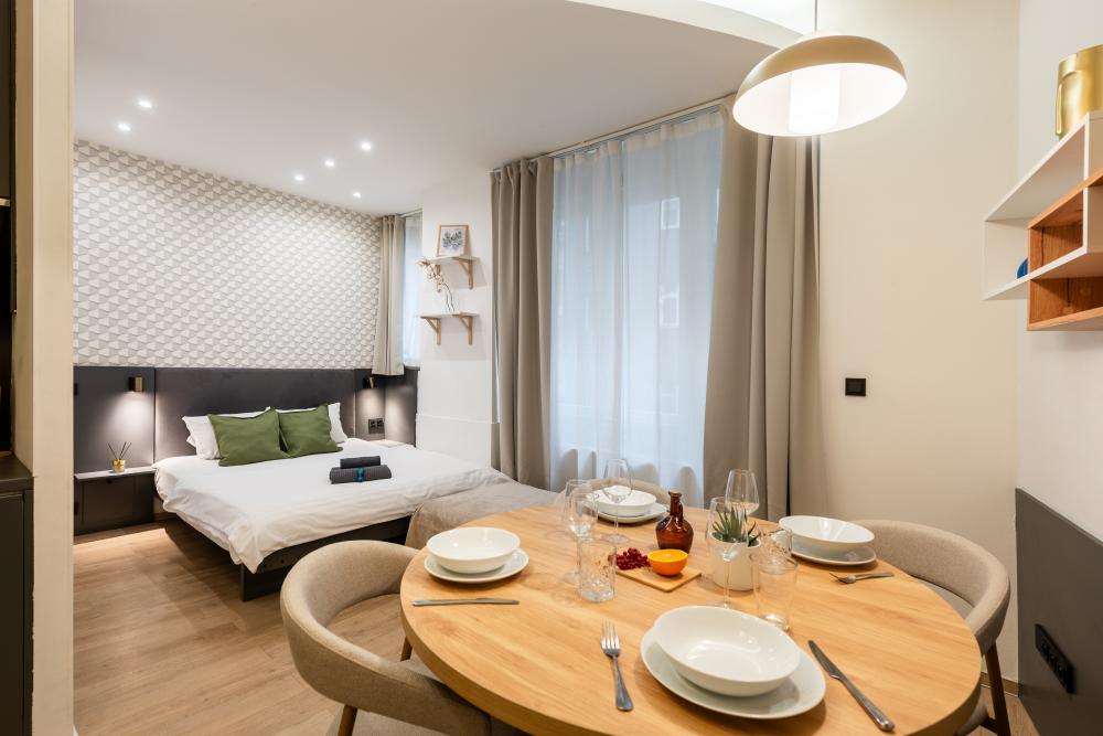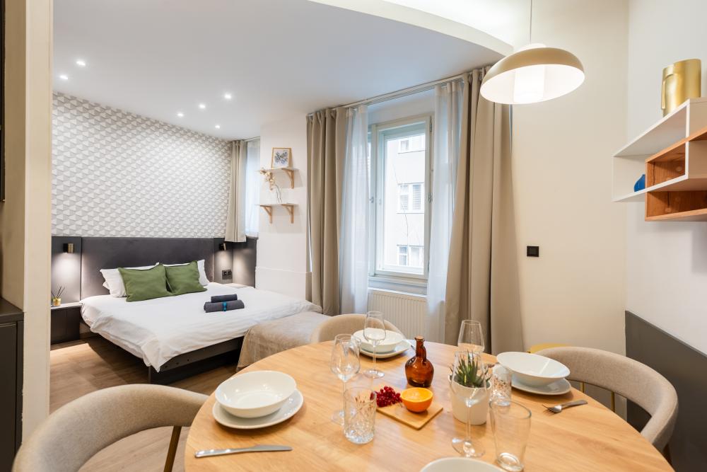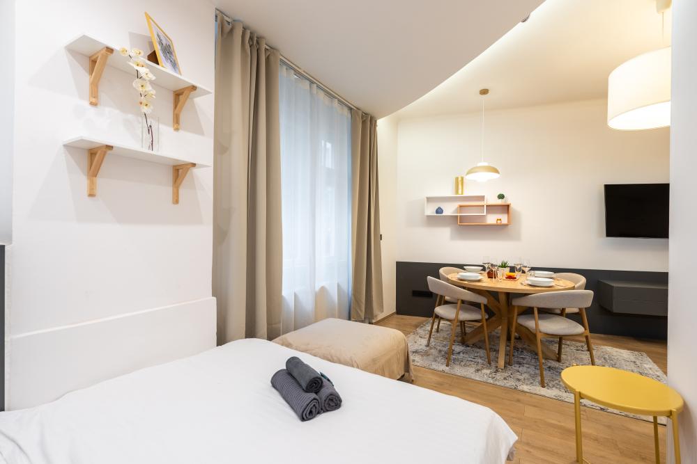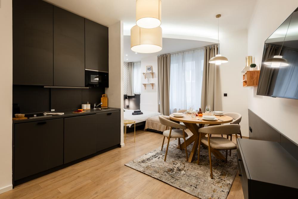 V bytě najdete velký otevřený prostor, který spojuje kuchyňský kout, ložnici a obývací prostor. Kuchyň má veškeré vybavení potřebné k přípravě chutného jídla, včetně sporáku, mikrovlnné trouby a myčky nádobí. K dispozici je prostorná manželská postel a pohovka, na které se po rozložení pohodlně vyspí dvě osoby. Rychlost Wi-Fi v apartmánu je 250/50 megabitů za sekundu.